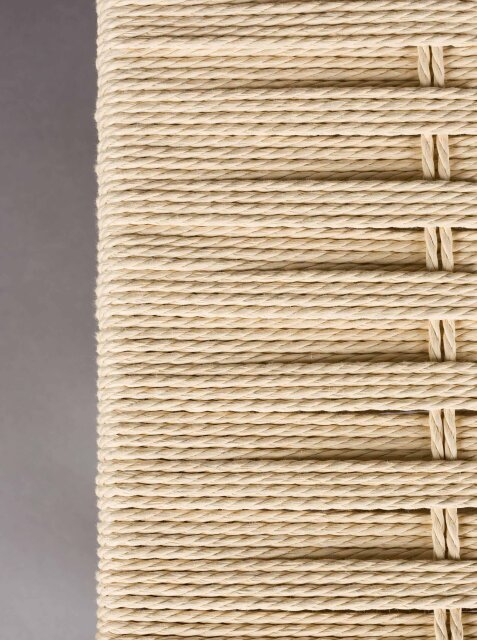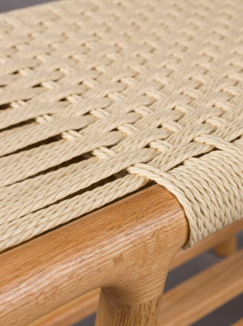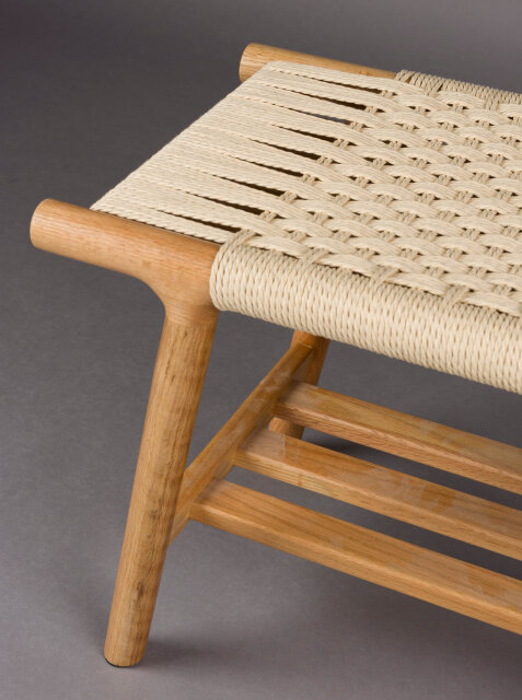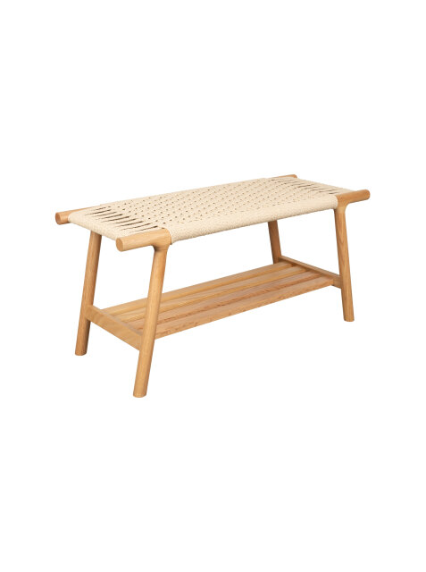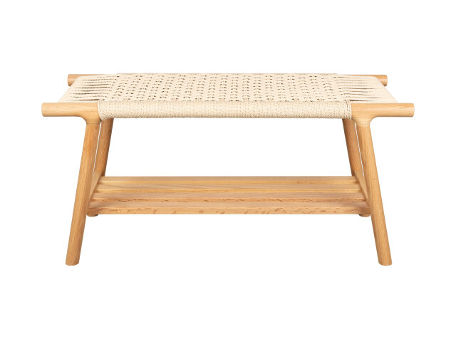 Sjedeća ploha isprepletena konopcem u vodoravnom i okomitom uzorku stvara upečatljivu teksturu i osjećaj ručne izrade, dok donja rešetkasta polica pruža prostor za knjige, obuću ili detalje koje želite imati pri ruci.