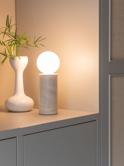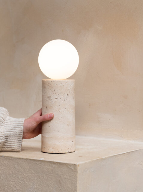 U stolnoj verziji svjetiljka Tivoli izgleda poput minijaturne skulpture. Njezina baza od mramora nosi kuglu toplog sjaja, podsjećajući na sunce koje se spušta na horizont. U toj jednostavnoj formi skriva se profinjena ravnoteža snage i lakoće, idealna za stvaranje intimne atmosfere.