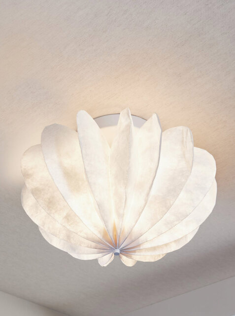 Sjenilo stropne svjetiljke Dalia podsjeća na cvjetni pupoljak te je ukrašen mekanim naborima koji dodaju skulpturalni karakter. Ova svjetiljka savršena je za minimalističke, skandinavske ili boho interijere, gdje će svojim organskim oblikom poslužiti kao suptilni naglasak koji privlači pogled bez narušavanja čiste estetike prostora. Dostupna je i kao podna i viseća svjetiljka!